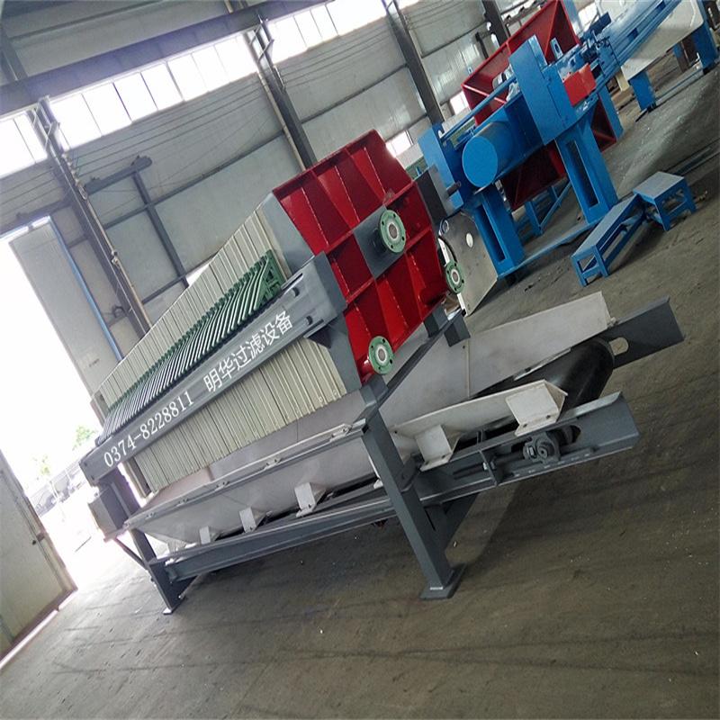 當(dāng)壓濾機(jī)壓緊后,就可以可進(jìn)行進(jìn)料的操作了:開啟進(jìn)料泵,并緩慢開啟進(jìn)料閥門,進(jìn)料壓力逐漸升高至正常壓力。這時(shí)觀察壓濾機(jī)出液情況和濾板間的滲漏情況,過濾一段時(shí)間后壓濾機(jī)出液孔出液量逐漸減少,這時(shí)說明濾室內(nèi)濾渣正在逐漸充滿,當(dāng)出液口不出液或只有很少量液體時(shí),證明濾室內(nèi)濾渣已經(jīng)*充滿形成濾餅。如需要對(duì)濾餅進(jìn)洗滌或風(fēng)干操作,即可隨后進(jìn)行,如不需要洗滌或風(fēng)干操作即可進(jìn)行卸餅操作。